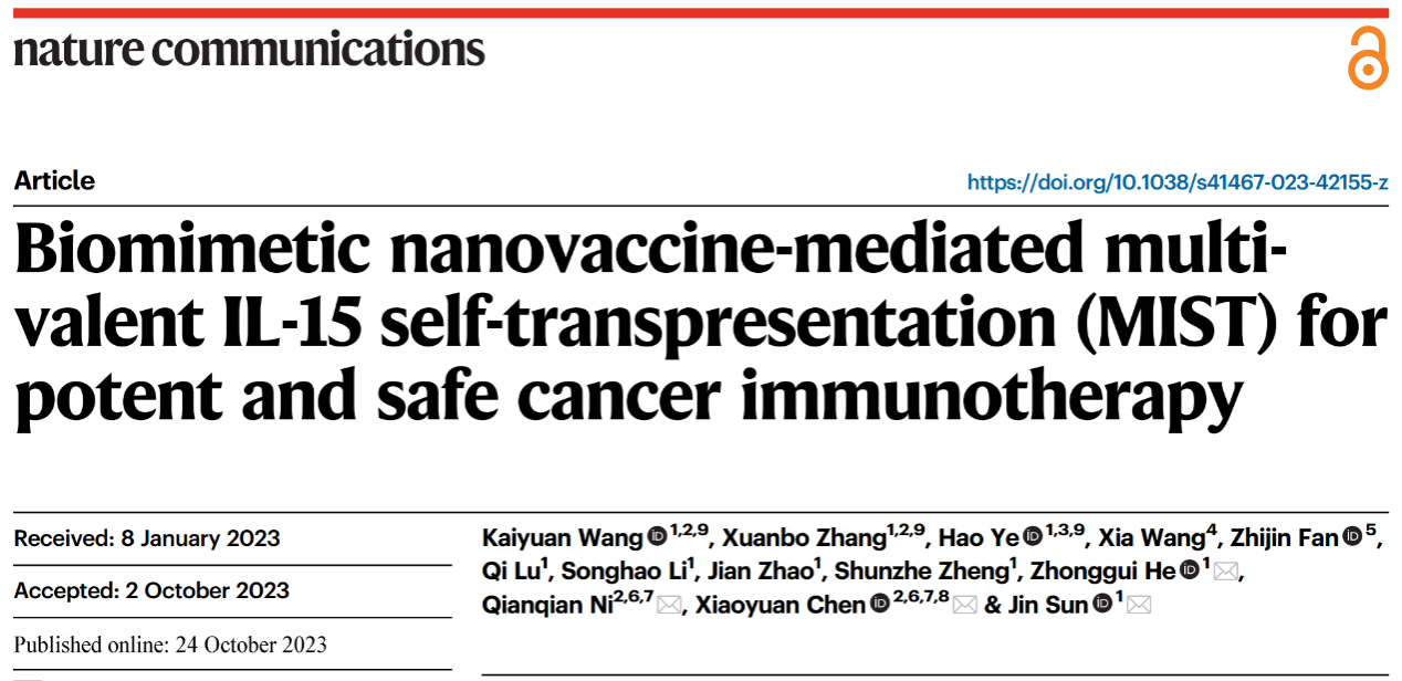 公司孙进教授和何仲贵教授报道仿生纳米疫苗介导多价IL-15自反式呈递用于有效且安全的肿瘤免疫治疗