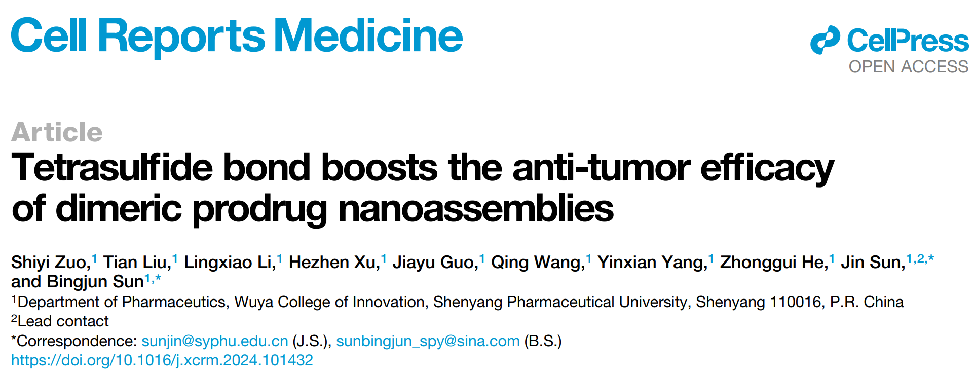 2024221bv伟德国际1946孙进/孙丙军团队在Cell旗下子刊《Cell Reports Medicine》(IF=14.3)发表题为“Tetrasulfide bond boosts the anti-tumor efficacy of dimeric prodrug nanoassemblies”的研究文章进一步探讨四硫键在构建前药自组装纳米递送系统中的应用伟德国际victor1946孙进教授和孙丙军教授为此文通讯作者,2021级博士生左诗意为第一作者,bv伟德国际1946为唯一通讯单位。