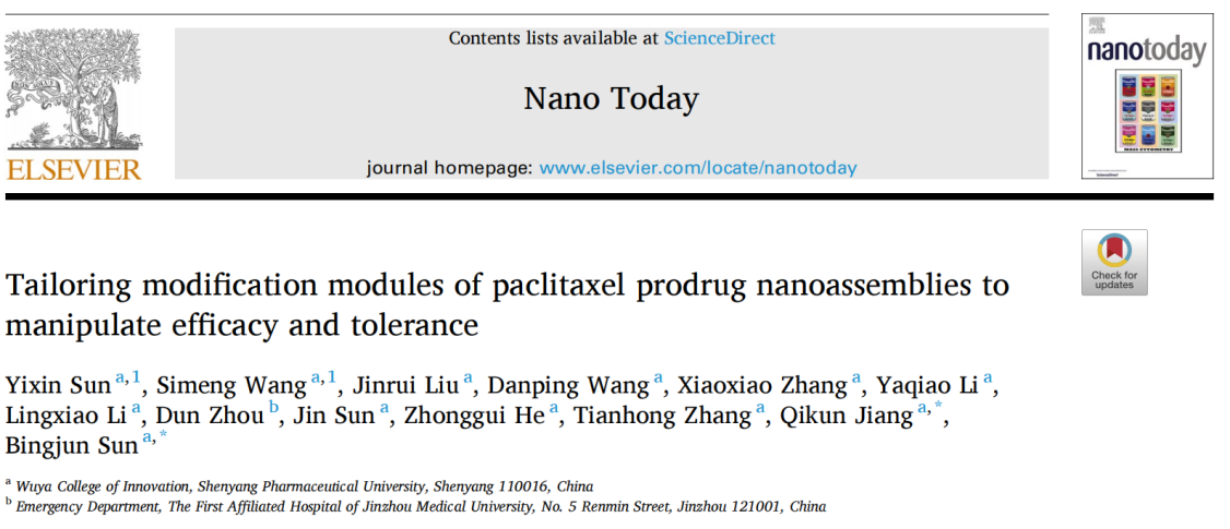 近日,bv伟德国际1946孙丙军教授和姜琪坤特聘教授在Elsevier出版的纳米领域著名期刊《Nano Today》(IF=17.4)上发表题为“Tailoring modification modules of paclitaxel prodrug nanoassemblies to manipulate efficacy and tolerance”的研究性论文,深入探究了不同碳链长度的支链脂肪醇作为修饰模块对前药纳米组装体组装机制、智能激活等方面的影响以及在调控前药纳米组装体药效学和耐受性方面的作用,为小分子前药的合理设计和有效筛选提供参考。伟德国际victor1946孙丙军教授和姜琪坤特聘教授为通讯作者,伟德国际victor1946博士后孙一鑫和硕士毕业生王思梦为本文共同第一作者,本工作得到了张天虹教授的大力支持与指导。