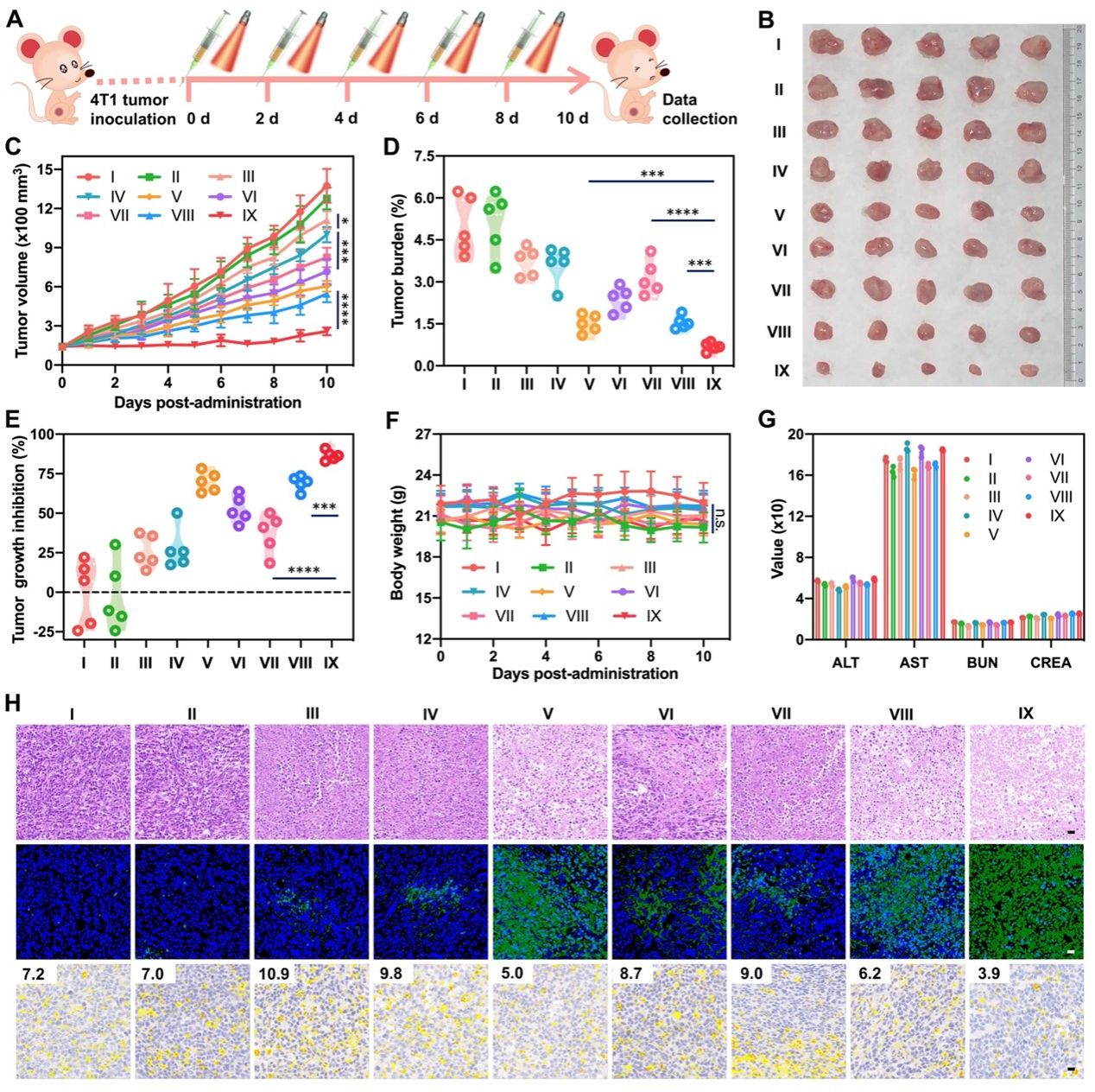 以4T1乳腺癌荷瘤BALB/c小鼠为动物模型,作者考察了ATO溶液剂、PPa溶液剂/光照、ATO/PPa混合溶液剂/光照、FSSPO纳米粒/光照、FSSPAO纳米粒/光照、HSSPAO纳米粒/光照、FCCPAO纳米粒/光照和FSSPAO纳米粒/光照的体内抗肿瘤效果。结果表明,兼具供氧和抑制耗氧能力的还原敏感FSSPAO纳米粒/光照组显示出明显的治疗优势,小鼠的肿瘤体积几乎没有增长。此外,以4T1乳腺癌荷瘤BALB/c小鼠为动物模型,综合考察了各组制剂的体内安全性。荷瘤小鼠体重变化曲线、肝肾功能指标和主要器官的H&E染色结果表明,FSSPAO纳米粒未表现出明显的系统毒性。