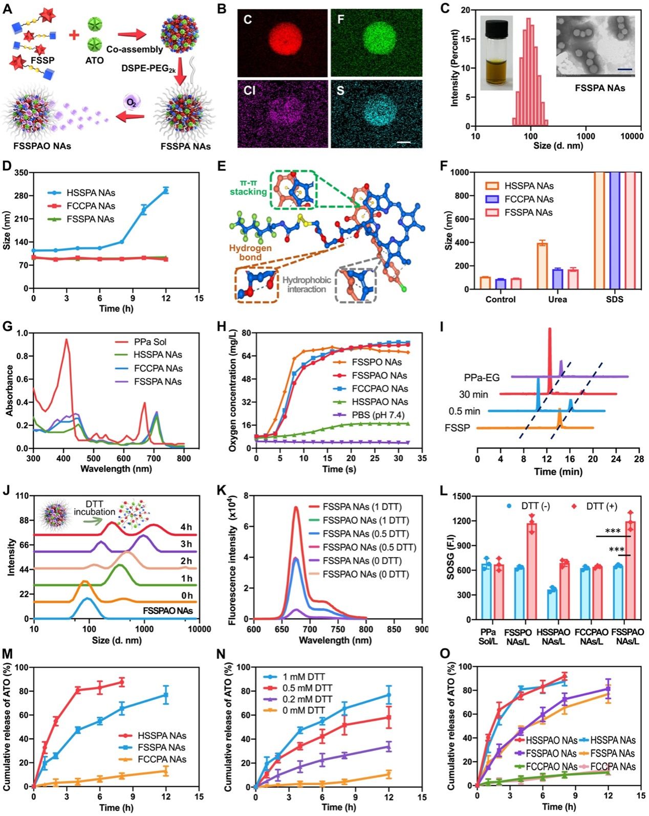 以DSPE-PEG2k作为修饰剂,制备了一系列不同摩尔比的FSSP/ATO杂化纳米组装体,通过其粒径与PDI筛选出了摩尔比2:1(FSSP/ATO)为最优制剂处方,并将其命名为FSSPA纳米粒,同时,同法制备了PEG化的FCCP/ATO与HSSP/ATO杂化纳米组装体,并将其分别命名为FCCPA纳米粒和HSSPA纳米粒。考察了FSSPA纳米粒、FCCPA纳米粒和HSSPA纳米粒的粒径、Zeta电位和外观形态。结果表明,FSSP中特有的F和S元素与ATO中特有的Cl元素能够共定位,三种纳米粒的PDI均小于0.2,均表现出负的Zeta电位且均具有球形的形态,且氟化纳米粒(FSSPA纳米粒和FCCPA纳米粒)的粒径明显小于非氟化HSSPA纳米粒的粒径,表明疏水性更强的氟化侧链具有更好促进前药自组装的能力。此外,考察了共组装纳米粒在含10%胎牛血清的PBS(pH 7.4)中的稳定性。结果表明,非氟化HSSPA纳米粒具有较差的稳定性,氟化纳米粒(FSSPA纳米粒和FCCPA纳米粒)则表现出良好的稳定性,表明氟化侧链可以通过增强PPa前药的疏水性来提高纳米粒的稳定性。利用分子对接技术和分子作用力破坏剂探究了FSSP和ATO共组装的机制。结果表明,氢键、疏水作用力和π-π堆积作用力共同介导了FSSPA纳米粒的组装过程。利用Zetasizer粒径分析仪和便携式荧光溶解氧分析仪检测了氧气饱和的FSSPAO纳米粒、FCCPAO纳米粒和HSSPAO纳米粒的制剂学性质和载氧能力。结果表明,载氧对纳米粒的粒径、Zeta电位和稳定性的影响较小;FSSPAO纳米粒和FCCPAO纳米粒分别展现出与FSSPO纳米粒和FCCPO纳米粒相似的载氧能力,而非氟化的HSSPAO纳米粒则不具备明显的载氧能力。考察了FSSPAO纳米粒缓解ACQ效应和产生单线态氧的能力。结果表明,FSSP前药在还原条件下会特异性激活并引发FSSPAO纳米粒的结构发生明显变化,进而导致了ACQ效应的缓解和单线态氧产生能力的提高。进一步地,探究了纳米粒在DTT存在条件下的体外ATO释放行为。结果表明,FSSPA纳米粒和HSSPA纳米粒均展现出还原敏感释放ATO的特性,且载氧对纳米粒体外释放ATO行为的影响较小。