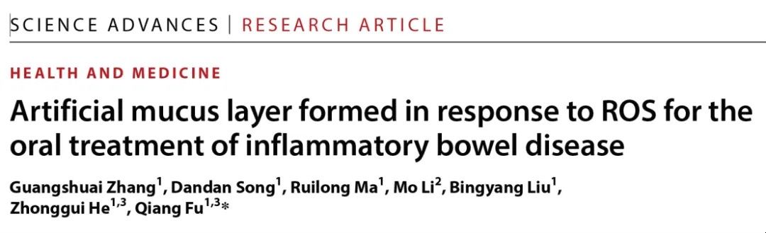近日,Science子刊Science AdvancesIF=11.7)在线发表了伟德国际victor1946何仲贵教授和付强教授课题组在ROS响应性人工黏液研究领域取得的最新研究成果,论文题目为“Artificial mucus layer formed in response to ROS for oral treatment of inflammatory bowel disease”。
